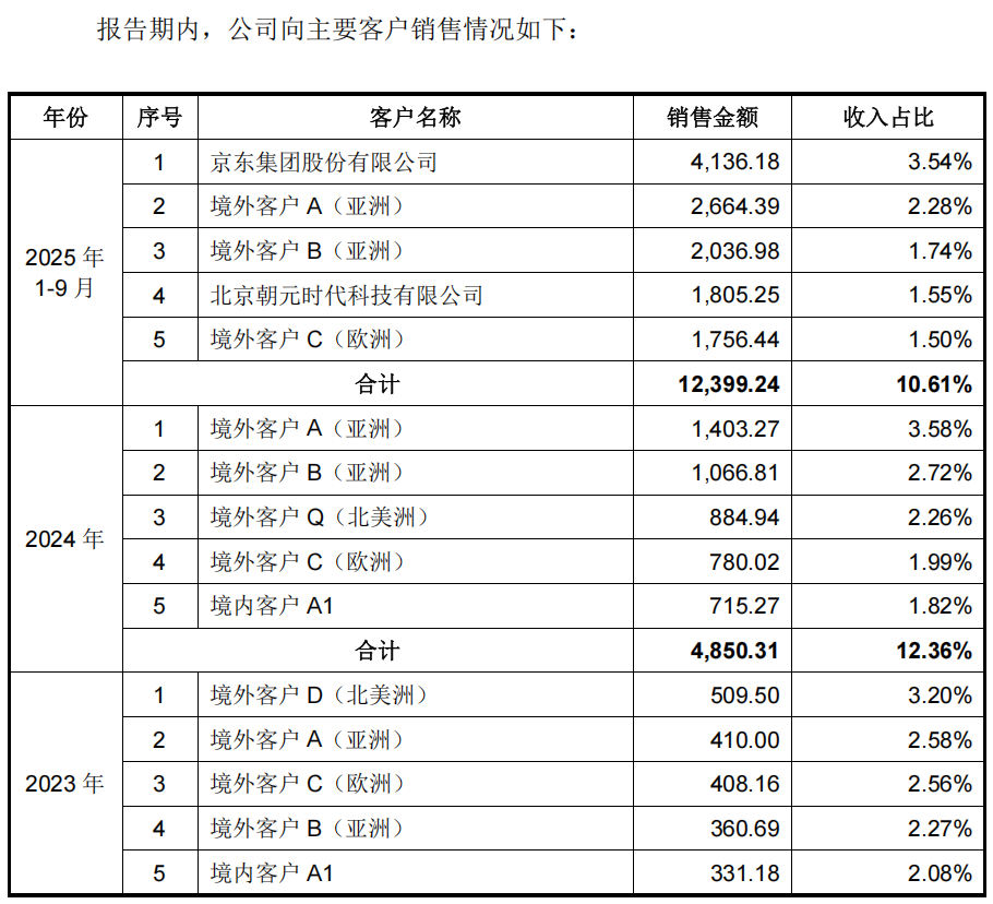 从披露的前五大客户的名称来看,2022年至2024年间,宇树科技的前三大客户均外境外客户。不过,在2025年1-9月,京东集团成为了宇树科技的第一大客户,贡献的营收占比达3.54%。