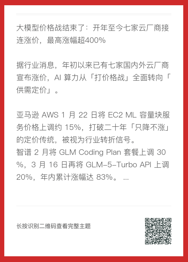 据行业消息,年初以来已有七家国内外云厂商宣布涨价,AI 算力从「打价格战」全面转向「供需定价」。