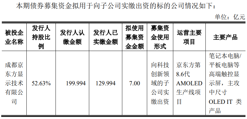 根据该期债券募集说明书显示,京东方拟将本期债券募集资金中的7亿元,用于向成都京东方显示技术有限公司实缴出资。