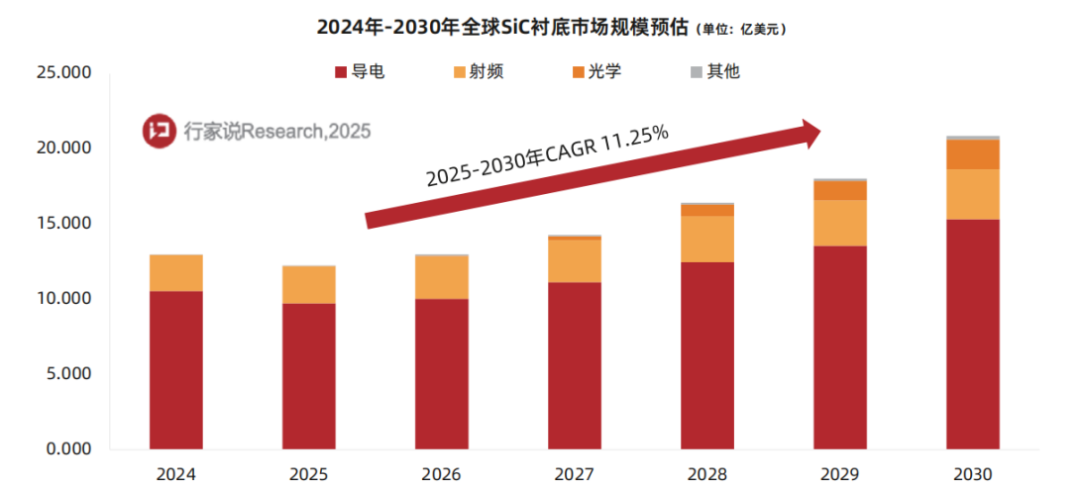 据行家说《2025碳化硅(SiC)衬底与外延产业调研白皮书》预测,到2030年,SiC 衬底产业产值将达到20.86亿美元,值得关注的是,在未来几年,光学和先进封装领域将成为SiC衬底的重要增长极,形成显著产值贡献。