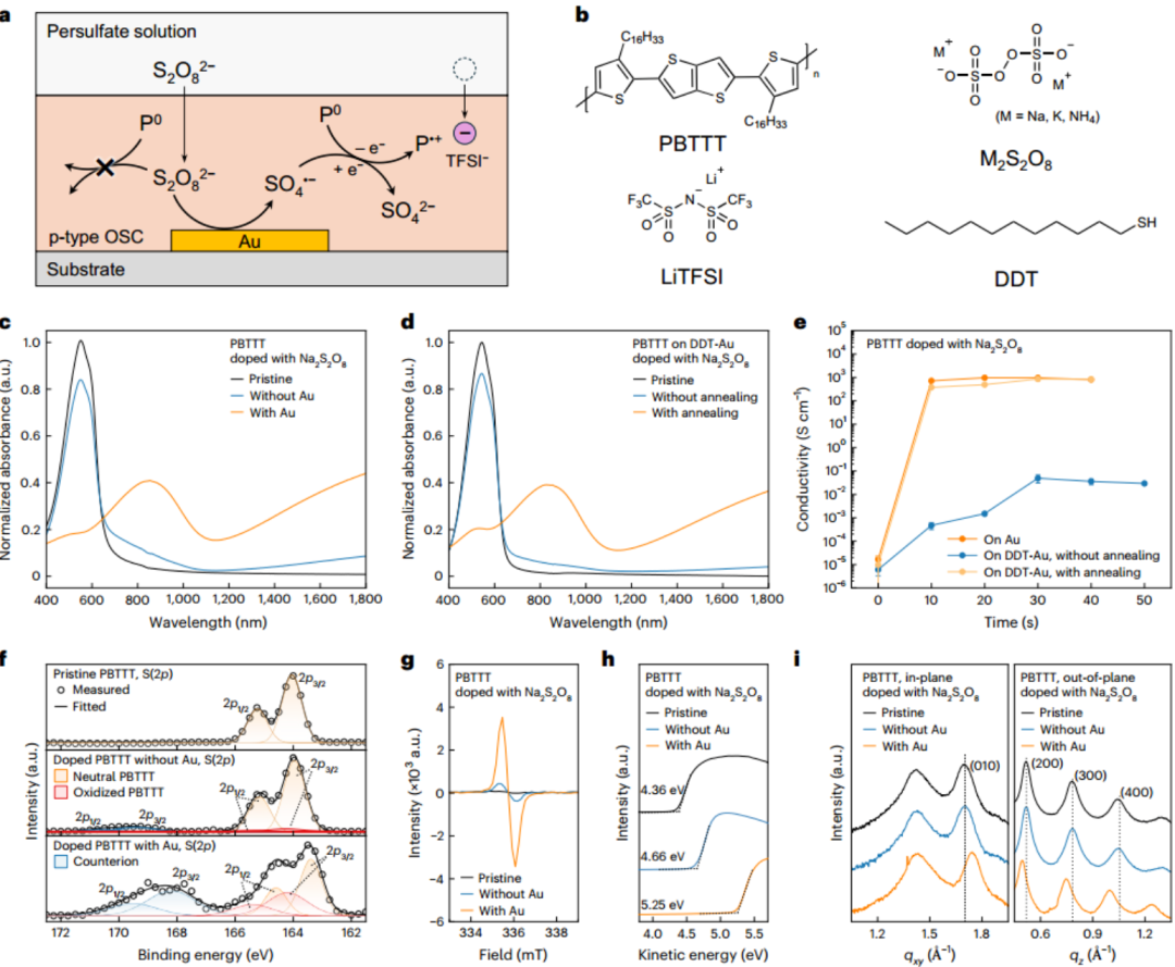 研究提出了GAP掺杂概念,证实了金表面能催化过硫酸盐均裂产生高活性硫酸根自由基,实现了对各种OSCs的高效p型掺杂。