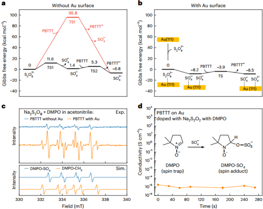 通过密度泛函理论 (DFT) 计算,研究揭示了金作为催化剂的核心作用。在没有金的情况下,过硫酸根通过直接电子转移氧化 PBTTT 的能垒极高。而当过硫酸根吸附在金表面时,其均裂生成 SO₄*⁻ 自由基的过程变为“无能垒”过程,显著降低了反应能耗。金不仅促进了活性自由基的生成,还能稳定中间体并利于多余电荷在聚合物骨架上的离域。实验层面,利用 DMPO 作为自旋捕获剂进行的 EPR 测量明确捕获到了硫酸根自由基的信号,且金的存在显著提升了自由基浓度。通过反证法,当向溶液中加入 DMPO 消耗自由基后,掺杂过程被彻底抑制,电导率不再上升,直接证实了硫酸根自由基是掺杂的活性物种。此外,LiTFSI 的加入虽然不直接掺杂,但通过放热的阴离子交换过程,提供了更稳定的反离子环境,使最终电导率提升了近一个数量级。
