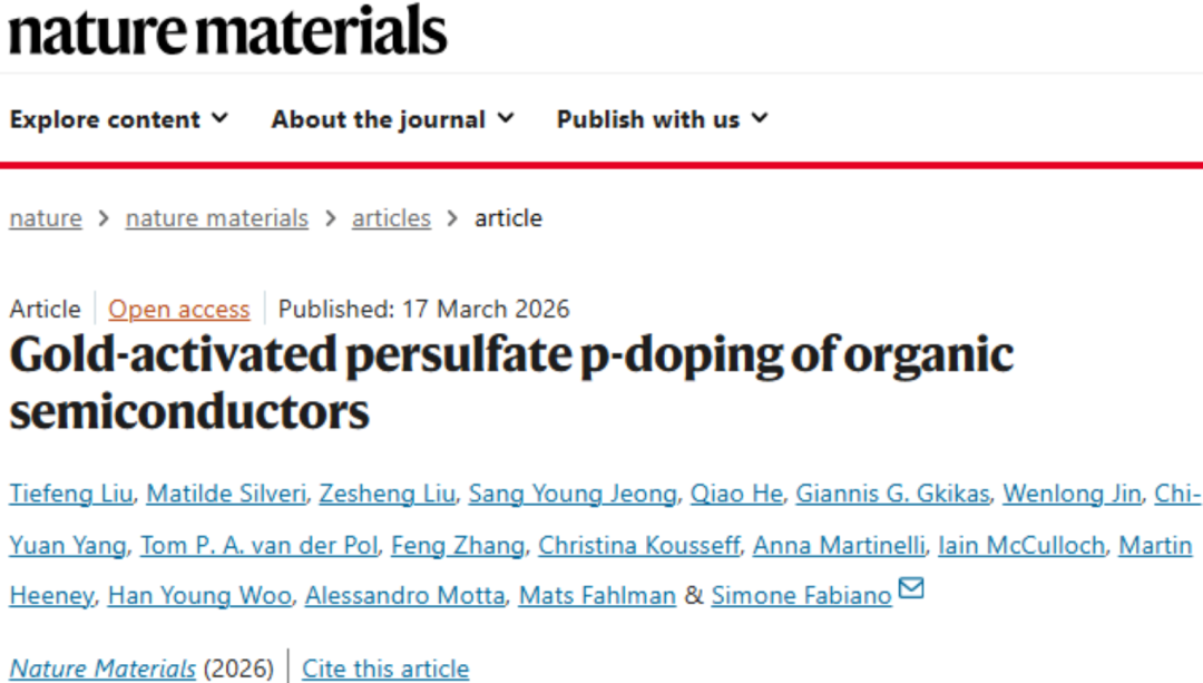 Liu, T., Silveri, M., Liu, Z. et al. Gold-activated persulfate p-doping of organic semiconductors. Nat. Mater. (2026).