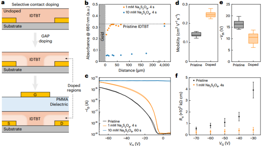 有鉴于此,瑞典林雪平大学Simone Fabiano等人提出了一种金激活的过硫酸盐(GAP)掺杂策略,其中过硫酸盐在金表面被催化激活,产生局部氧化(p型掺杂)OSCs的SO₄*⁻自由基。这种反应创造了一个从金界面向外延伸的横向掺杂梯度,这已通过光谱和电学表征得到证实。该方法广泛适用于跨越1.5 eV电离能范围的OSCs,并产生>1,900 S cm⁻¹的电导率。为了展示这种方法的影响,作者应用GAP掺杂来调节溶液处理的有机场效应晶体管(OFETs)中的接触区域,实现了接触电阻的显著降低和电荷载流子迁移率的提高。这种简单、可扩展的方法能够从溶液中形成横向掺杂梯度,并为有机电子学中的界面调控提供了新的机会。