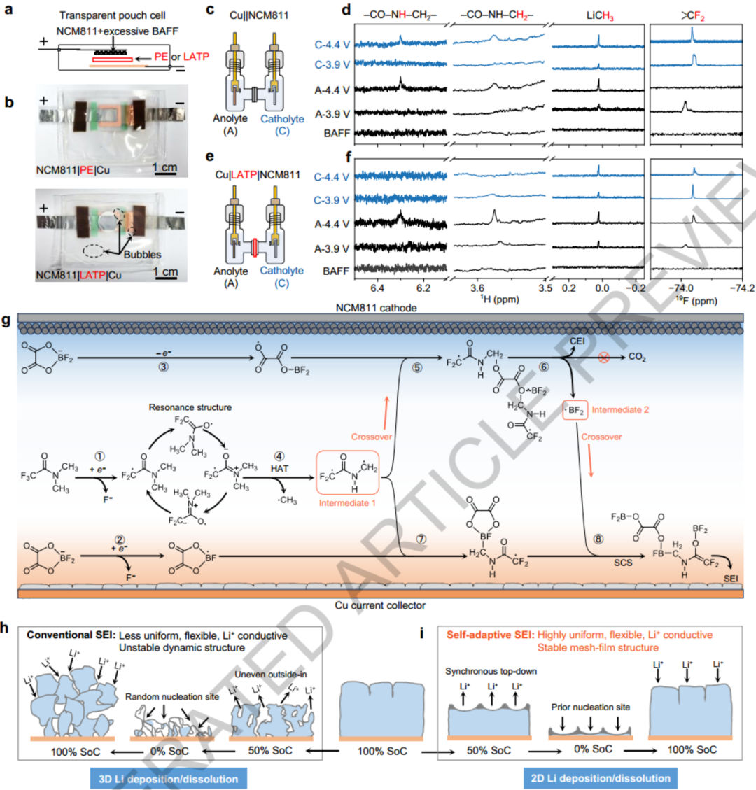 为探究产气抑制和聚合物SEI形成的根源,作者设计了H型电池和透明软包电池实验。研究发现,当使用固态电解质隔绝正负极物质交换(交叉)时,BAFF体系会重新出现剧烈产气和SEI组分变化,证明了正负极交叉耦合的关键作用。机理研究表明,负极产生的酰胺自由基(中间体1)会迁移至正极,清除引起产气的DFOB⁻氧化分解中间产物;同时,正极产生的•BF2自由基(中间体2)迁移至负极,触发自旋中心转移(SCS)反应,诱导含氟酰胺发生自由基加成和交联,从而生成不溶的富聚合物SEI。这种基于双电极氧化还原产物跨空间输运并化学耦合的“交叉耦合界面化学”,彻底改变了以往对界面膜仅由局部单极反应生成的认知,为电解液设计开辟了新维度。