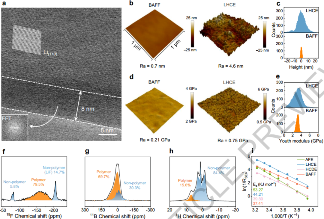 通过多维度表征,作者深入揭示了BAFF衍生SEI的独特属性。Cryo-AC-TEM显示该SEI厚度仅约8 nm且呈无定形态。AFM测得其表面极其平整(粗糙度仅0.7 nm),且杨氏模量分布极窄,展现了亚纳米级的均匀性。化学成分分析(XPS、FTIR、NMR等)表明,该SEI不同于传统的“外有机/内无机”双层结构,而是一种富含B-F基聚合物(分子量>2000 Da)的单层结构,大部分B和F元素存在于聚合物组分中。此外,EIS测试证实该SEI具有极低的锂离子传输活化能(37.4 kJ/mol),意味着更快的动力学过程。这种高柔韧、超均匀且快速传导的聚合物SEI,是实现大载量平面锂沉积的核心物理基础,这与传统电解液形成的易碎、非均匀无机盐主导界面形成了鲜明对比。