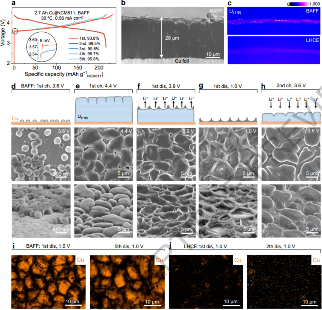BAFF电解液诱导形成8 nm超薄柔韧聚合物SEI,实现了5.6 mAh/cm²高面容量下可逆平面锂沉积,库仑效率达99.8%,有效抑制了传统3D松散沉积模式。