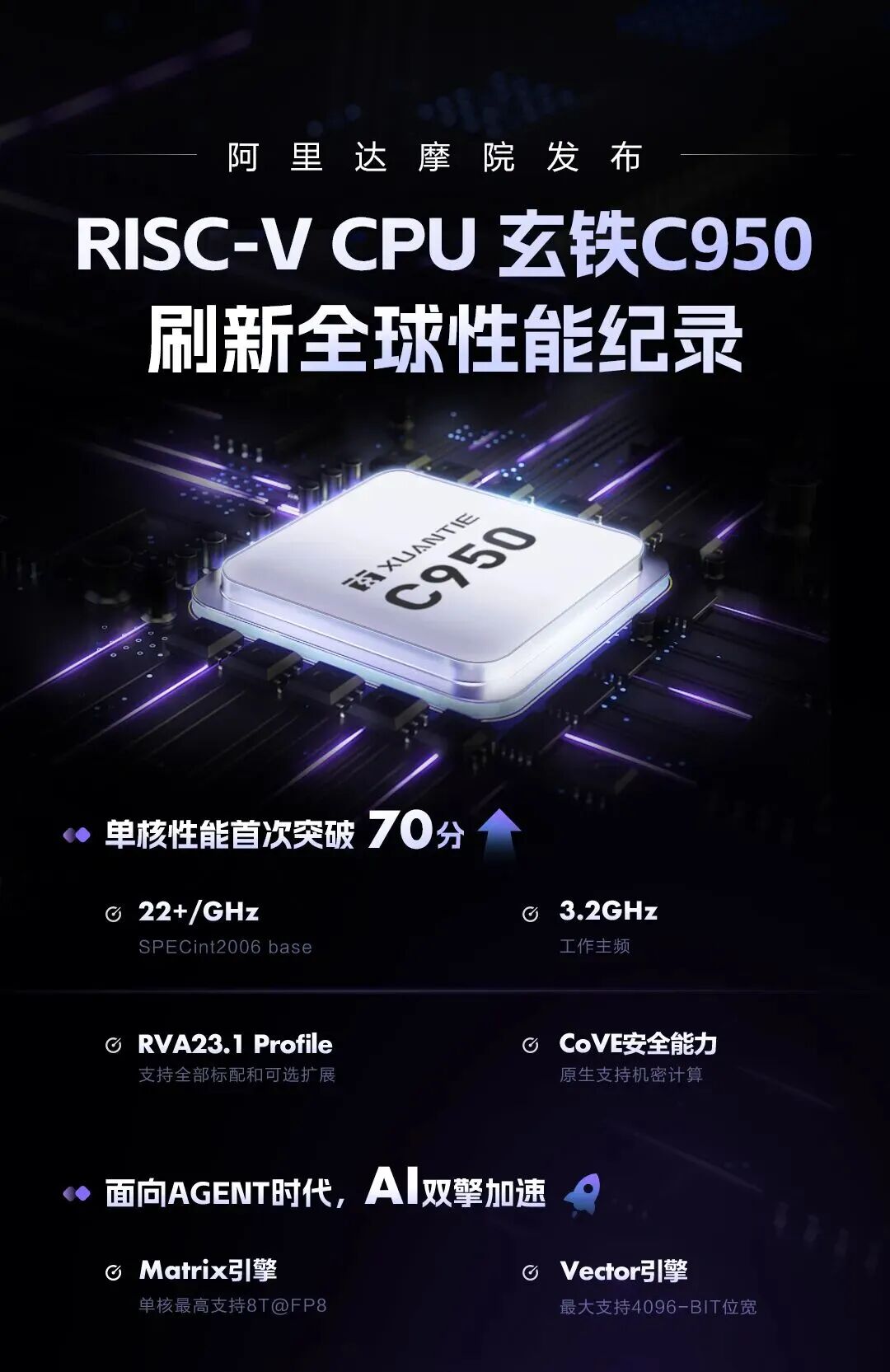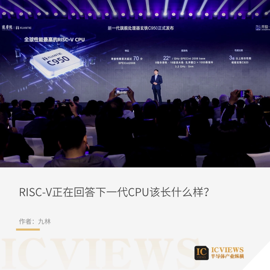 今年玄铁生态大会上,达摩院把这条线继续推高:新一代旗舰CPU玄铁C950。按大会披露,C950在SPECint2006基准测试中突破70,单核性能超过22/GHz,最高主频达到3.2GHz,成为目前性能最强的RISC-V CPU。