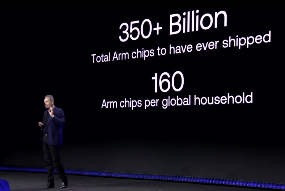 近三十多年来,Arm作为全球最大的半导体IP提供商,为全球数千亿台设备提供了可扩展、高能效的计算能力。根据Arm在发布会上公布数据显示,目前基于Arm架构的芯片累计出货量已超过3500亿颗,全球每个家庭的 Arm 芯片数量平均达到了160个。