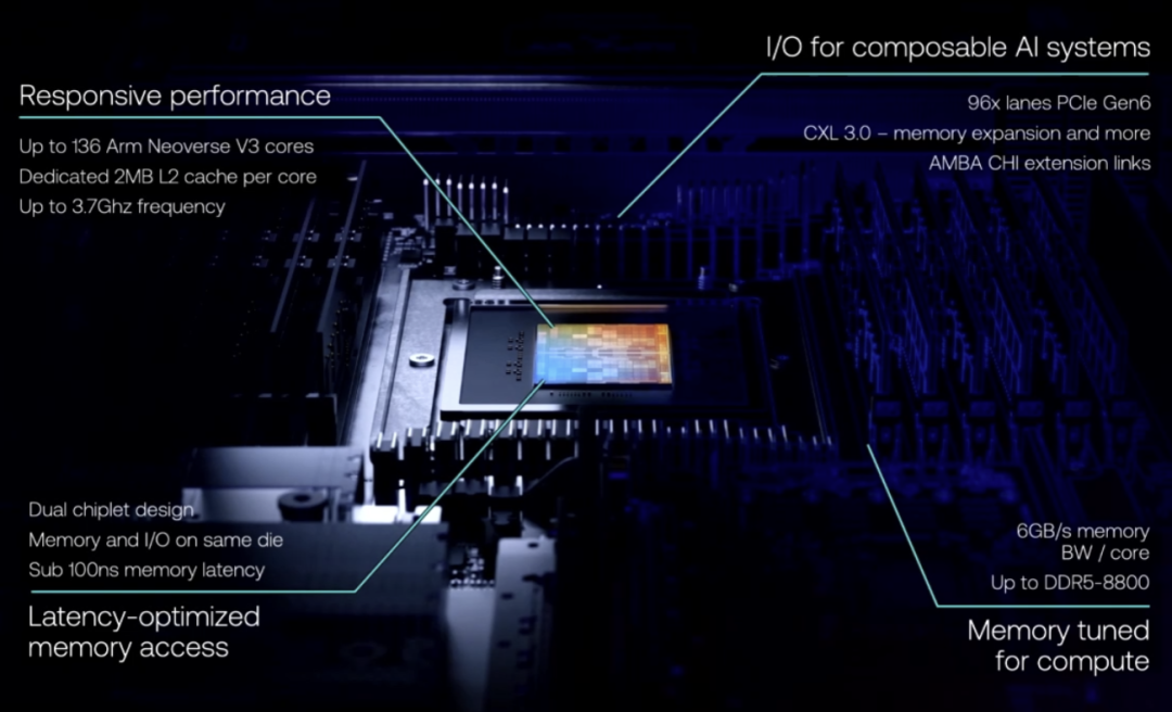 在内存和接口支持方面,AGI CPU它支持 12 通道 DDR5 内存,最高可达 8800 MT/s,可提供超过 800 GB/s 的总内存带宽,或每核心 6GB/s的带宽,延迟低于100ns。I/O包含96条PCIe Gen6通道,并原生支持CXL 3.0以实现内存扩展和池化。