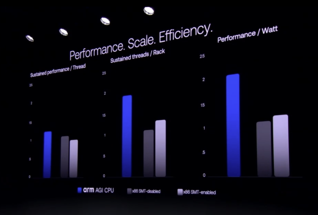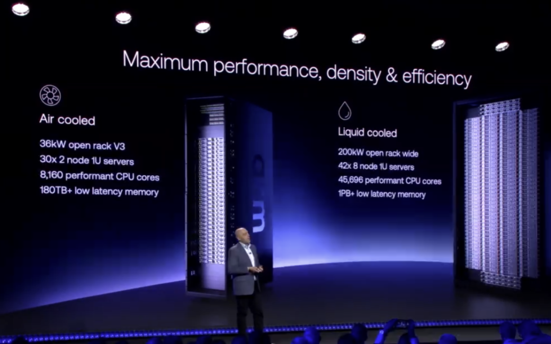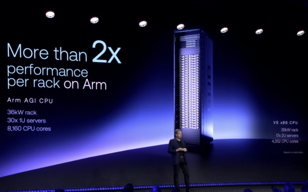 Arm表示,AGI CPU 可实现单机架性能达到 x86 CPU平台的两倍以上。