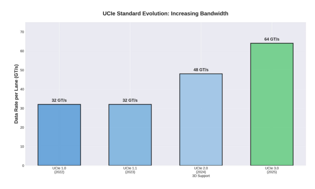 UCIe 3.0:于 2025 年 8 月发布的 UCIe 3.0 版本,支持高达 64 GT/s 的单通道数据速率,相较于早期版本,其带宽能力大致翻了一番。更高的链路带宽有助于满足现代 GPU 和加速器设计对数据传输日益增长的需求。