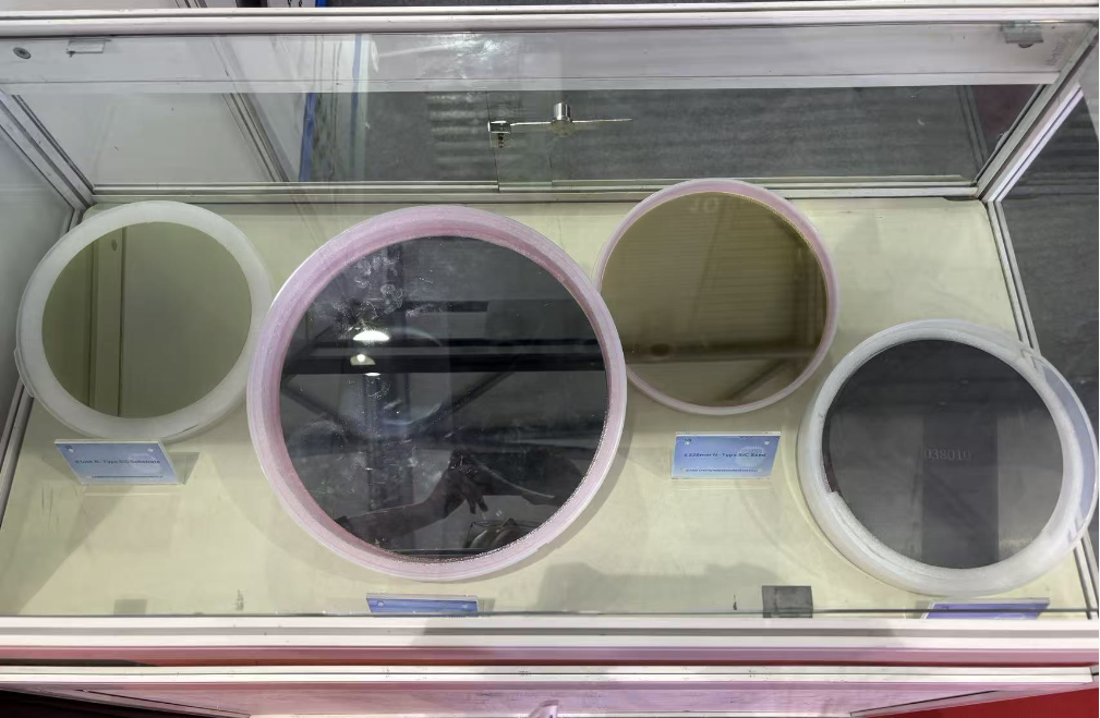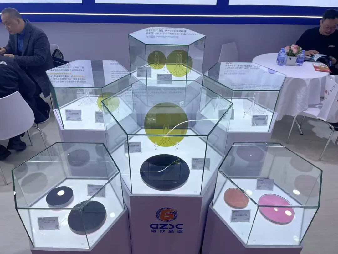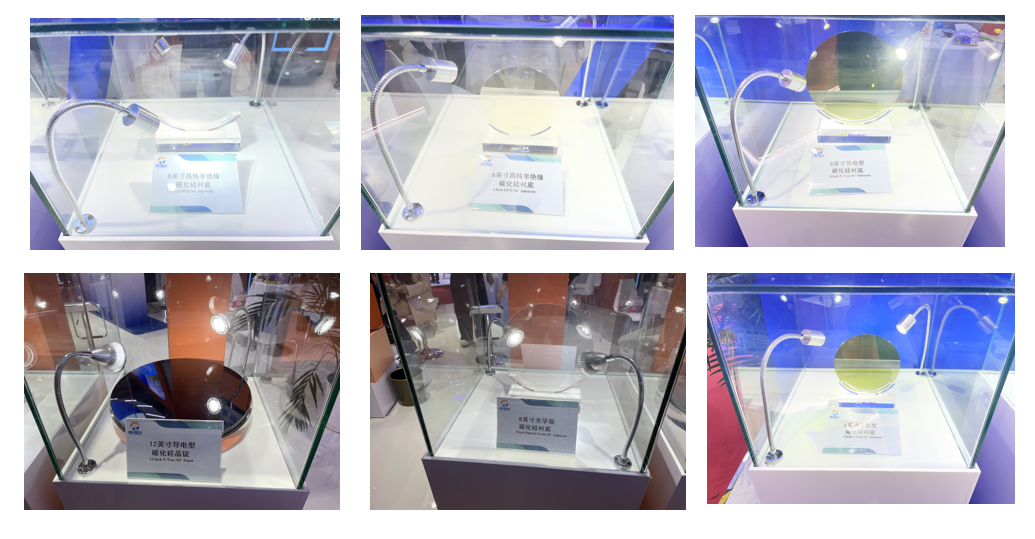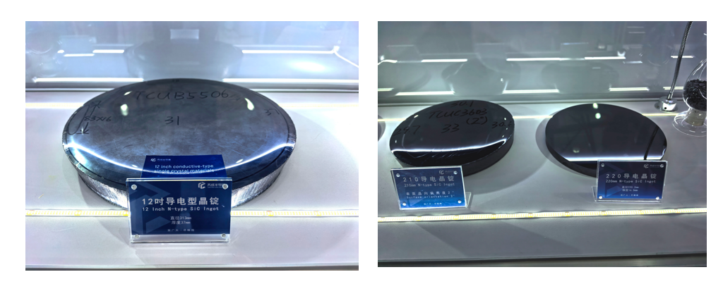 南砂晶圆在展会中重点展示了多款核心产品,涵盖6/8英寸导电型及半绝缘型碳化硅衬底与晶棒,以及12英寸4H-SiC单晶碳化硅衬底与晶棒。