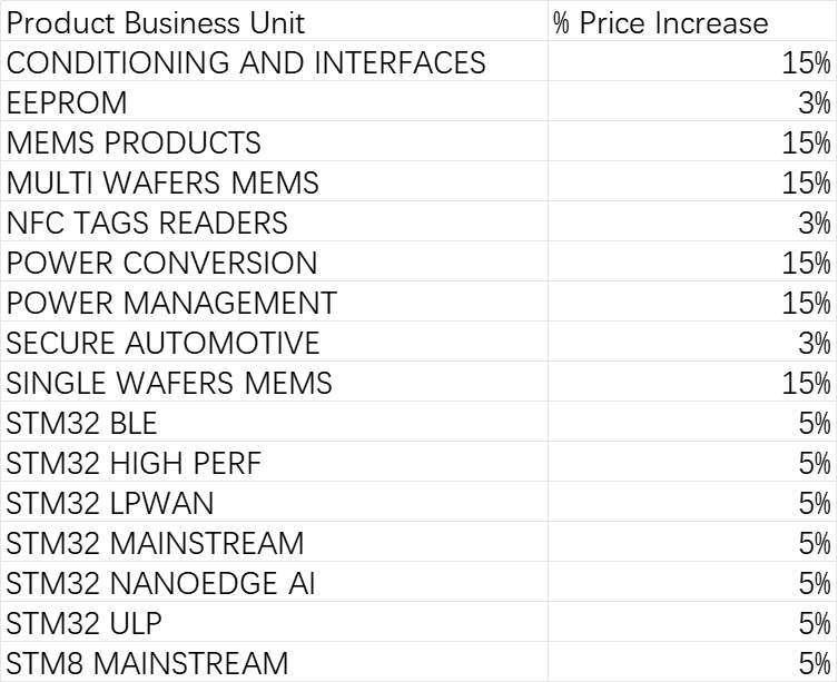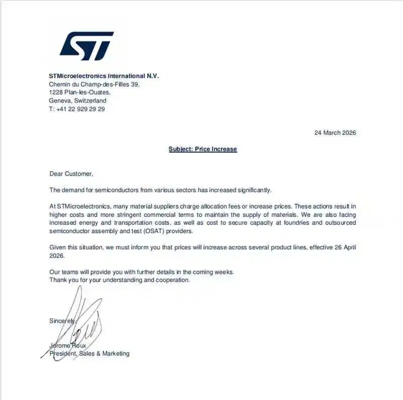 3月24日,意法半导体(ST)发布涨价函。函中表示,因综合成本持续上升,自2026年4月26日起,公司多个产品线将启动价格上调。据内部消息,此次ST各产品线的涨价幅度如下:在意法半导体,我们面临着多重成本上涨压力:诸多材料供应商正收取配额费用或上调材料价格,不仅直接推高我们的生产成本,同时为保障材料稳定供应,相关商业合作条款也更为严格。此外,能源、运输成本的持续攀升,以及为锁定晶圆代工厂、外包半导体封装测试(OSAT)供应商产能所产生的额外成本,进一步加剧了成本压力。鉴于上述多重因素,我们在此通知您,自2026年4月26日起,公司多个产品线的价格将进行上调。未来几周内,我们的团队将向您提供更为详细的涨价相关信息。"添加小助手申请进群"