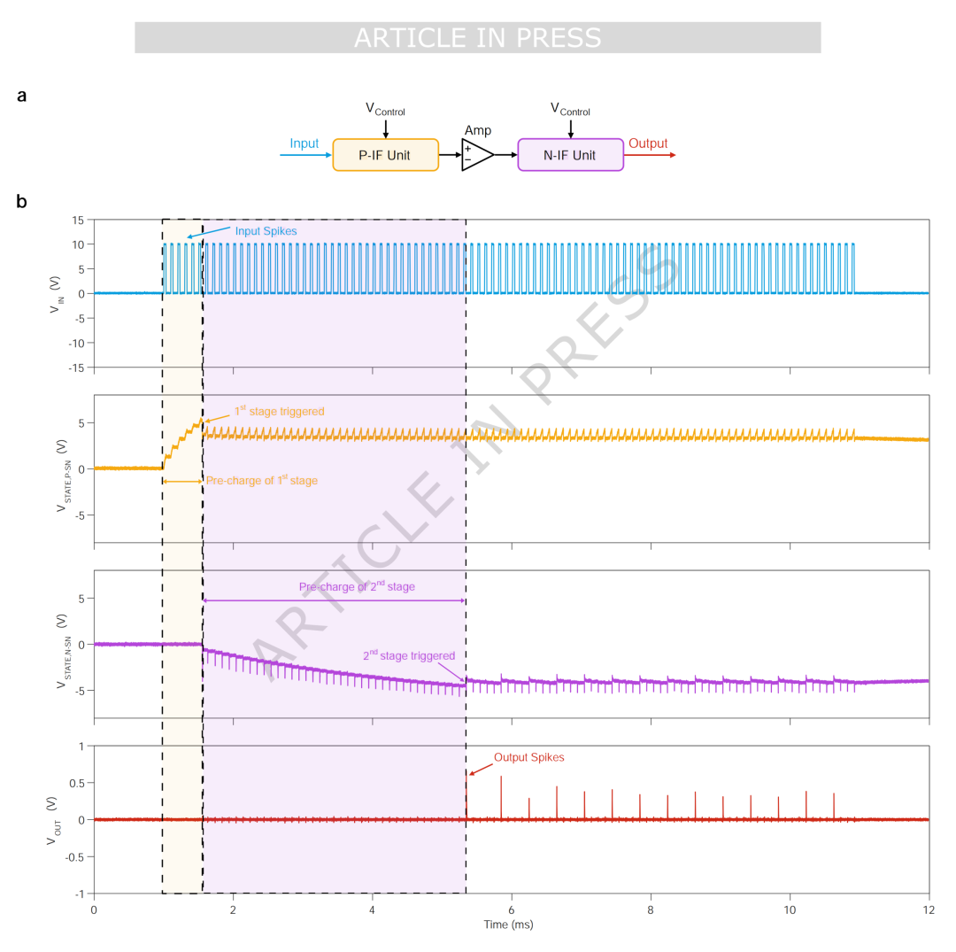 基于这一高性能可编程NDR,研究团队构建了由感知神经元(sensory neuron)、脉冲逻辑门(logic neuron)和积分发放神经元(integrate-and-fire neuron)组成的低温神经形态计算架构,为在极低温下实现高能效、可扩展的本地化控制电路提供了新的技术路径(图1f)。本研究展示了两种不同输入/输出极性的积分发放神经元(图2),可实现神经元之间的高效模拟级联。其中积分发放是神经形态电路中的关键单元,在模拟计算和脉冲神经网络领域具有广阔的应用前景。