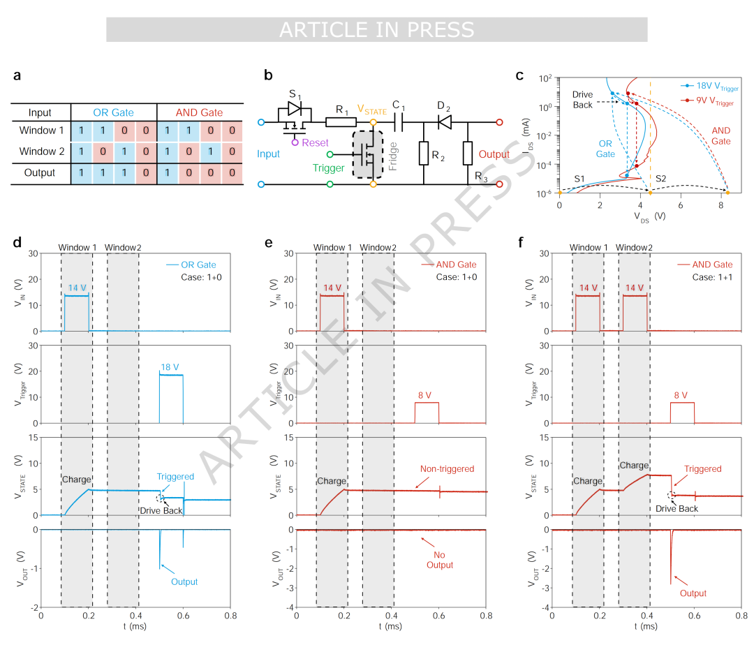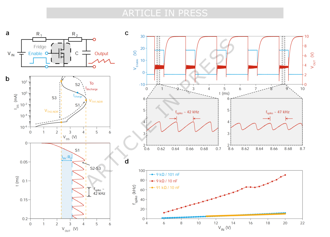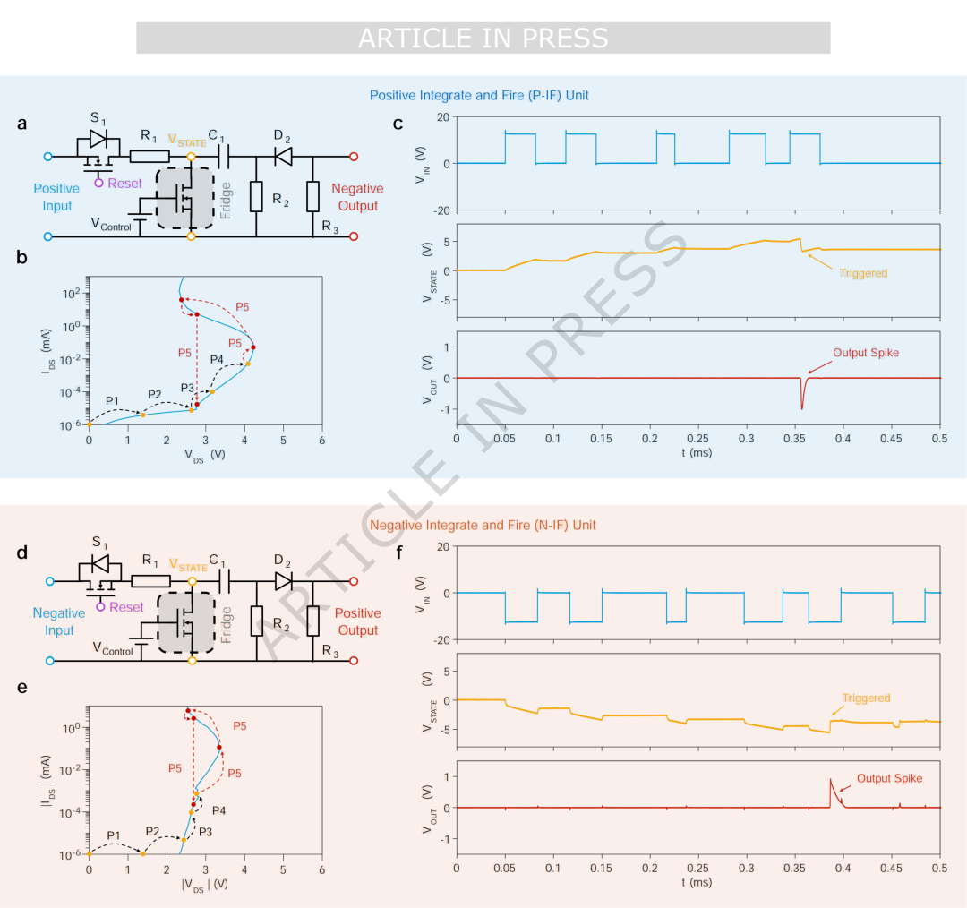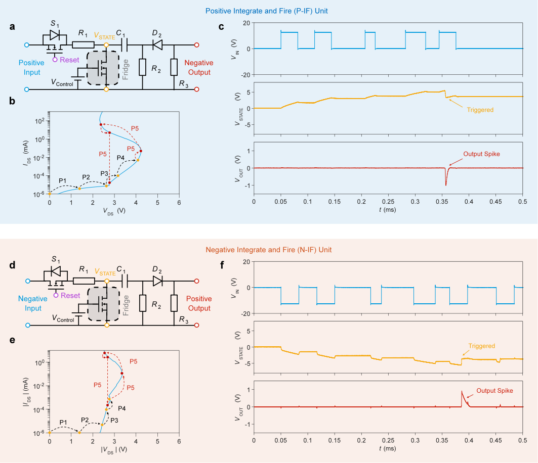 图2:基于NDR的正型与负型积分发放神经元:(a)正型积分发放(P-IF)单元的电路示意图,(b)P-IF单元中SiC MOSFET的工作阶段示意,(c)P-IF单元中输入VIN、VSTATE和输出VOUT的实测波形,(d)负型积分发放(N-IF)单元的电路示意图,(e)N-IF单元中SiC MOSFET的工作阶段示意,(f)N-IF单元中输入VIN、VSTATE和输出VOUT的实测波形。