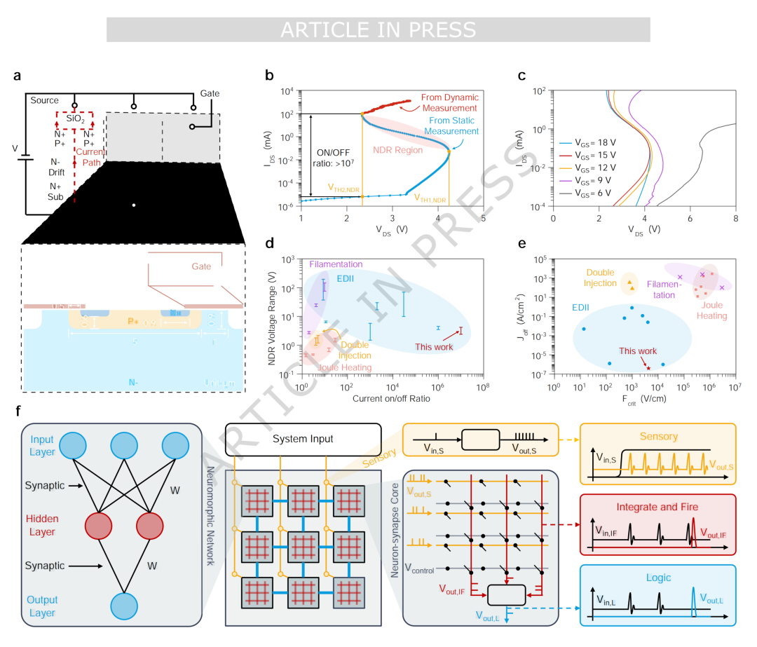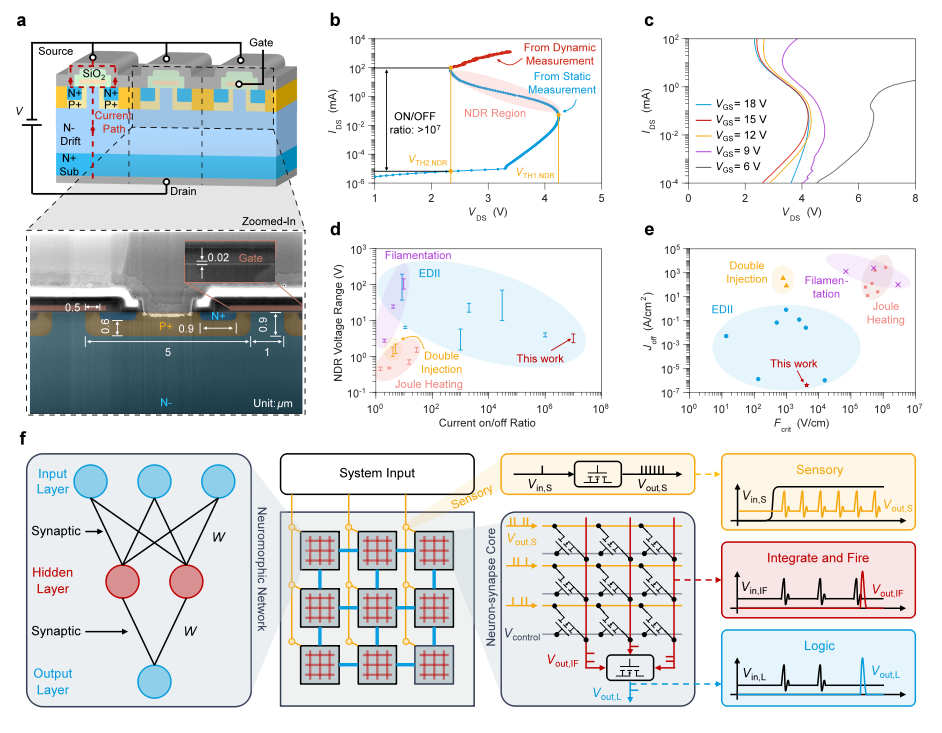 图1:SiC MOSFET中的负微分电阻及其在脉冲神经形态电路中的应用:(a)垂直结构SiC MOSFET元胞结构示意图及扫描电镜图像,(b)SiC MOSFET在低温下的输出特性,(c)栅压对负微分电阻的调控作用,(d)NDR电压范围与开关电流比(Ion/Ioff)对比,(e)关态电流密度(Joff)与NDR起始临界电场(Fcrit)对比,(f)基于栅控负微分电阻的神经形态网络架构示意图。