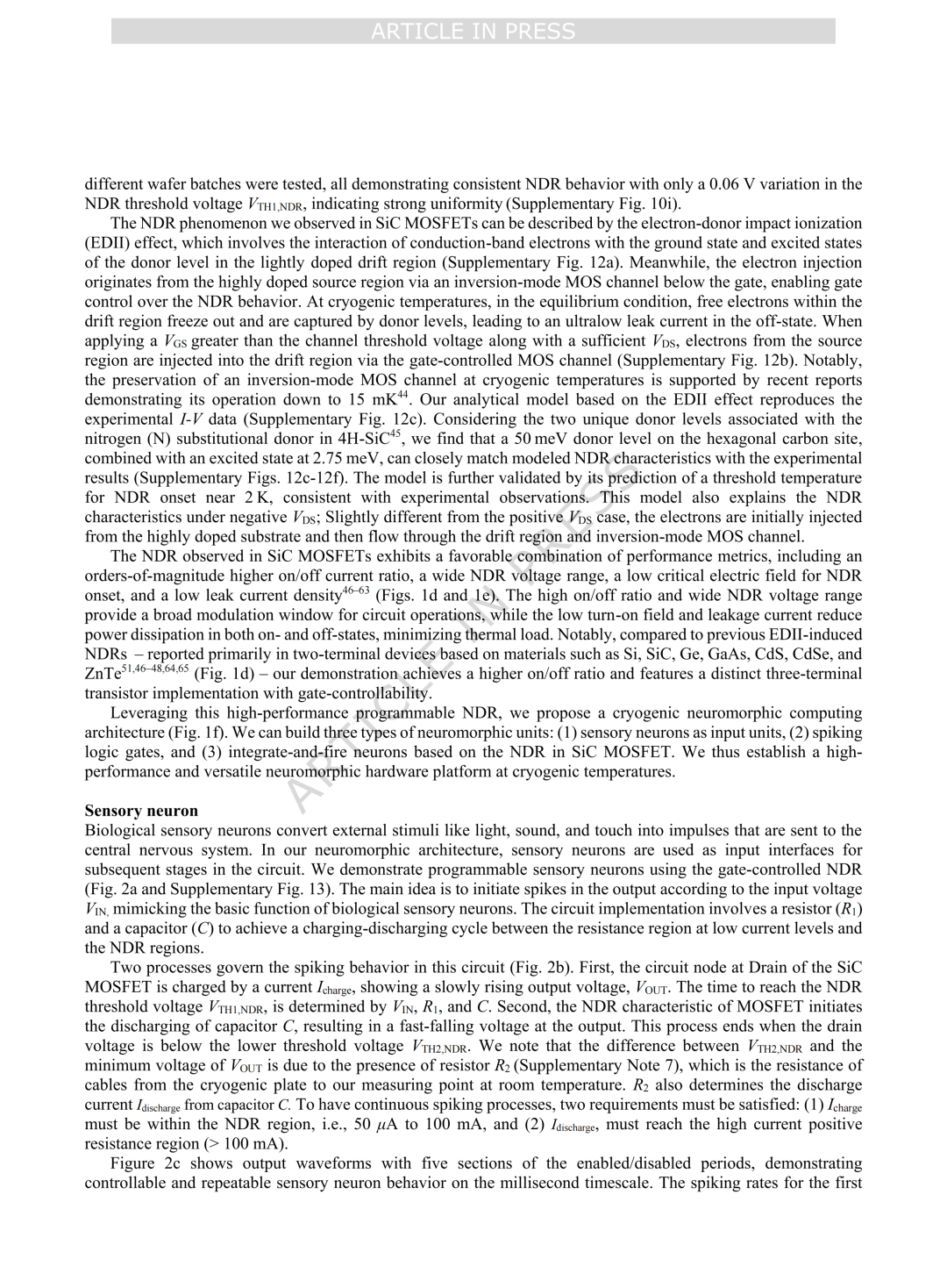 (2)在SiC MOSFET中观察到的NDR行为源于SiC材料体系固有的两种氮替代施主能级。该机制对沟道结构和掺杂浓度的变化具有鲁棒性,确保了器件之间及批次之间的高一致性与可重复性,而这正是大规模集成中许多其他NDR器件所面临的关键挑战。未来,SiC中EDII诱导NDR的物理机制可推广至多种半导体材料平台,用于开发神经形态器件,并有望在高温条件下也可实现类似的EDII诱导NDR行为。