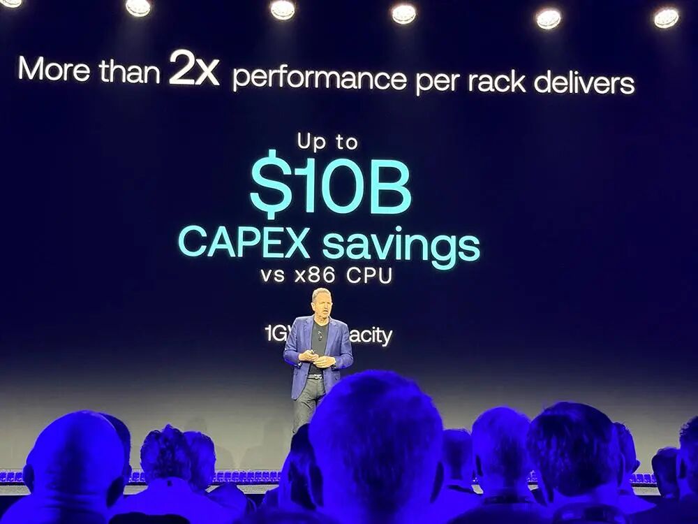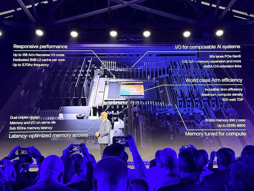 3月25日,半导体 IP 巨头 Arm 在美国旧金山正式推出首款自主设计的数据中心 CPU —— Arm AGI CPU,是一款由Arm自主设计、面向人工智能 (AI) 数据中心的 CPU,旨在满足日益增长的代理式AI (Agentic AI) 工作负载需求。这款基于台积电 3nm 制程工艺、采用双 Chiplet 架构的芯片,标志着 Arm 成立 35 年来首次涉足自研芯片销售业务,并正式切入数据中心这一核心算力市场。Arm将其称作“全球最高能效的智能体CPU”,围绕性能、规模、能效三个原则来设计。据介绍,Arm AGI CPU是一款300 W处理器,由两个Chiplet组合而成,拥有 136 个 Neoverse V3 核心,最高主频可达 3.7 GHz(基础频率 3.2 GHz),分布在两颗采用台积电 3 nm工艺制造的芯片上。该处理器每个核心配备 2 MB 的 L2 缓存,以及 128 MB 的共享系统级缓存 (SLC)。在 I/O 方面,该处理器配备了 96 条 PCIe 6.0 连接通道,并支持 CXL 3.0。在DRAM方面,该CPU支持12通道DDR5——最高8800 MT/s的内存速度,总带宽为825 GB/s,相当于每个核心6 GB/s。与英特尔和AMD最新x86芯片相比,Arm表示Arm AGI CPU 可实现单机架性能达到 x86 平台的两倍以上,每吉瓦 AI 数据中心算力的资本支出 (CAPEX) 节省高达 100 亿美元。在业界看来,Arm这一举打破了其长期以来将IP授权给自行制造和销售芯片公司的模式,将Arm Neoverse平台扩展到IP和Arm计算子系统 (CSS) 之外,为客户提供更丰富的Arm计算部署选择。Arm CEO Rene Haas分享说,按其估算,自人类诞生以来,大约共有1170亿人生活在这个星球上。而Arm芯片累计出货量已超过3500亿颗,足足是有史以来人类总数的3倍,是所有非Arm架构CPU累计出货量总和的7倍,平均每个全球家庭拥有160颗Arm芯片。