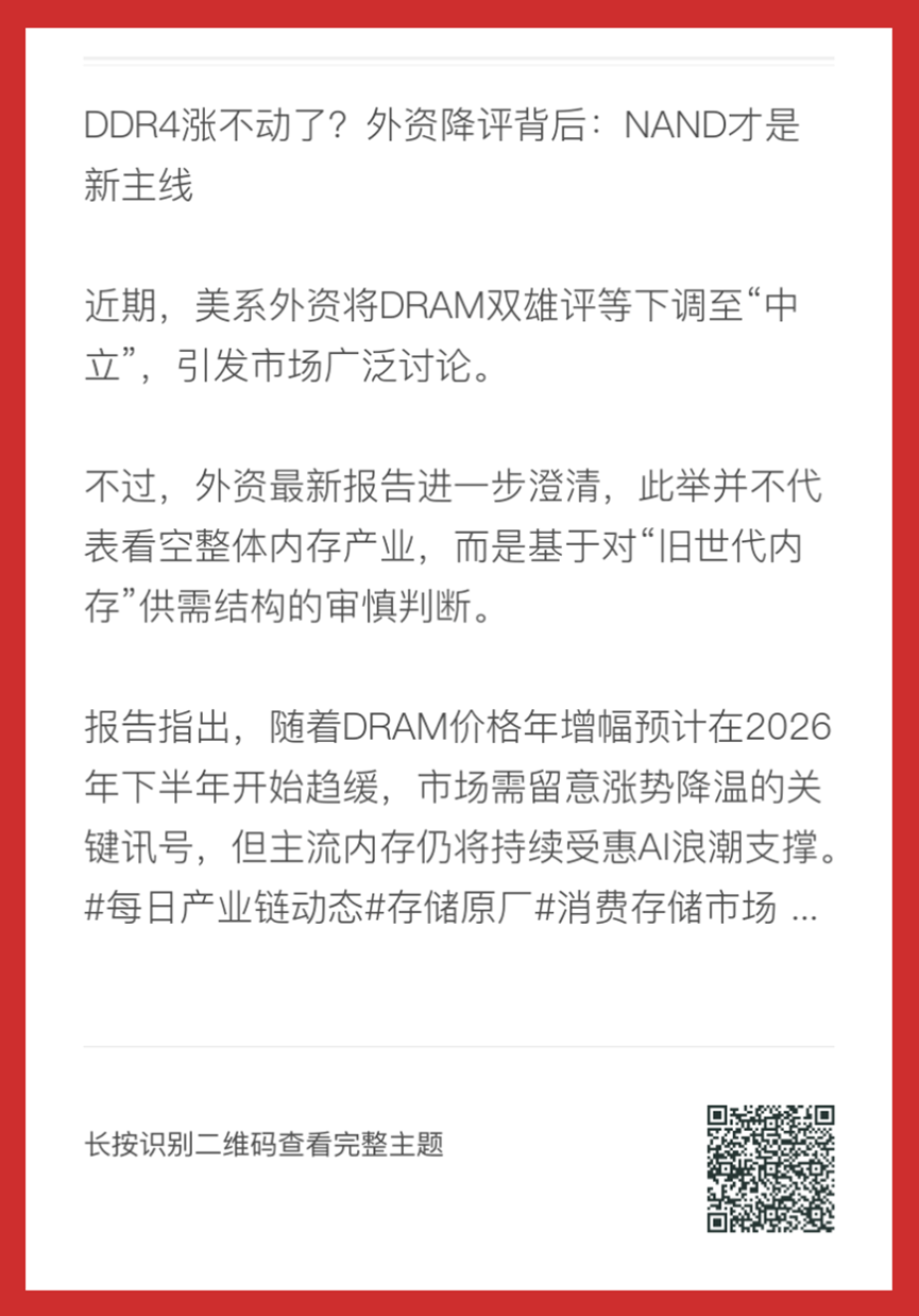 DDR4价格上涨已对消费性市场(如PC与智能手机)造成抑制,加上DDR4缺乏直接AI应用场景,难以受惠AI带动的内存需求爆发,使其后续动能受限。