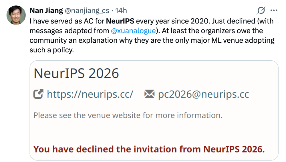 强化学习研究者姜楠宣布退出已担任多年的审稿工作,质疑 NeurIPS 为何成为唯一推行此类政策的 AI 顶会。