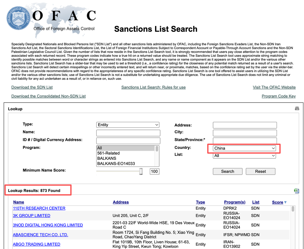 公开数据显示,仅以 “中国” 为筛选条件,OFAC 制裁清单相关条目达873 条,覆盖华为、商汤、旷视、云天励飞等核心 AI 企业,中芯国际、海康威视、大疆、中科曙光等科技实体,以及中国移动、联通、电信三大运营商,几乎囊括中国 AI 科研与产业核心力量。