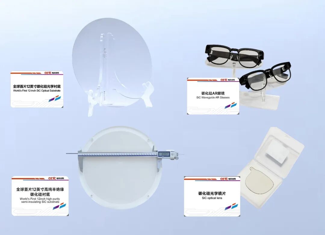 电科材料携碳化硅晶体衬底及外延、硅外延、硅基氮化镓外延等核心产品矩阵展出,吸引了海内外众多嘉宾与专业观众的高度关注。公司产品覆盖4-12英寸全规格体系,技术水平达到国际领先,可广泛应用于集成电路芯片、半导体分立器件制造,满足新能源汽车、智能电网、AR眼镜等多领域应用需求。电科材料全球首片12英寸碳化硅光学衬底和全球首片12英寸高纯半绝缘碳化硅衬底,是AR眼镜光学镜片及其他光学制品的优质制备材料。其折射率达2.7以上、视场角80°-110°,性能大幅优于传统光学材料,可显著提升AR眼镜的佩戴舒适度与视觉沉浸感,是本届展会的核心亮点产品之一。