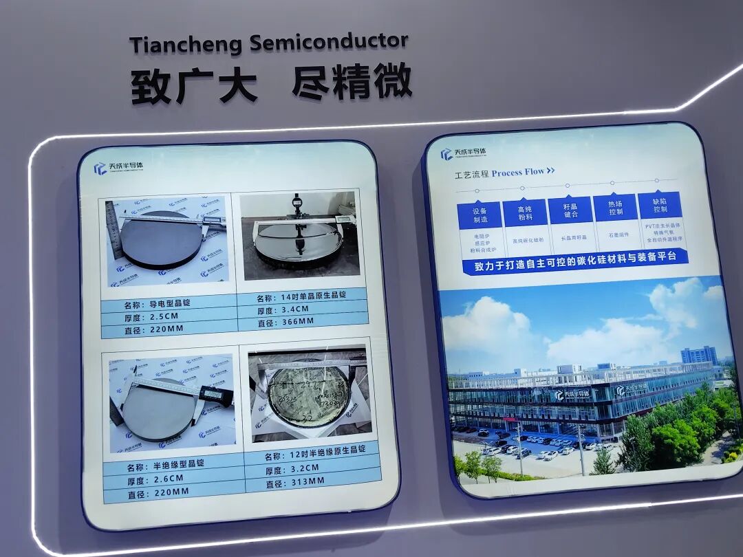 天成半导体重点展示12英寸光波导晶锭(厚度28mm)、12英寸导电晶锭(厚度30mm)、偏角2°的8英寸晶锭,以及各类规格的籽晶,同时现场还展出了8–14英寸长晶及配套设备,其技术实力与未来发展潜力吸引了众多参会人士的广泛关注。