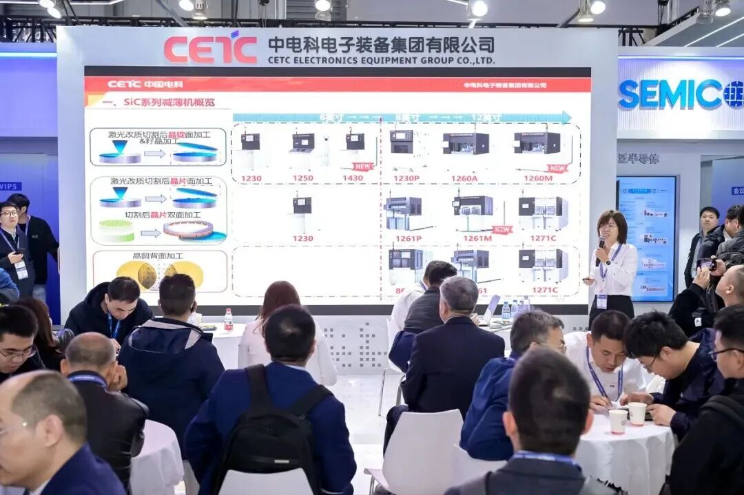 中电科装备集团携离子注入机、电子束直写设备、化学机械抛光设备、半导体检测设备等多项“单项冠军”设备组成方阵亮相,现场还举行多场新品发布会,推出新款离子注入机、新型检测设备、12英寸卧式炉等多款新装备,充分展现了其从“单点设备”向“整线集成”与“系统解决方案”的关键技术突破及产业化进程,彰显了国内唯一化合物半导体成套装备解决方案能力提供商的实力水平。