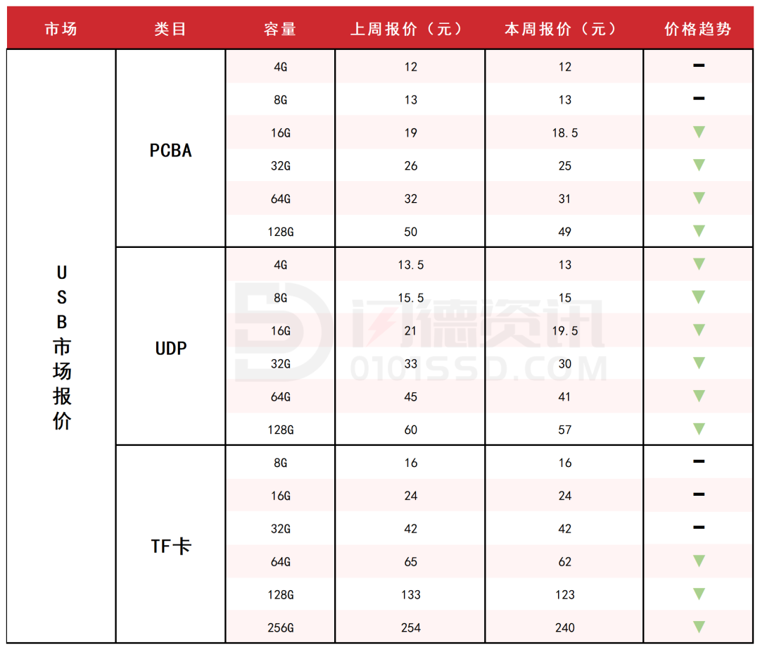 USB/TF卡市场加速下跌,买盘乏力,大容量TF卡跌幅明显,短期抛压延续。