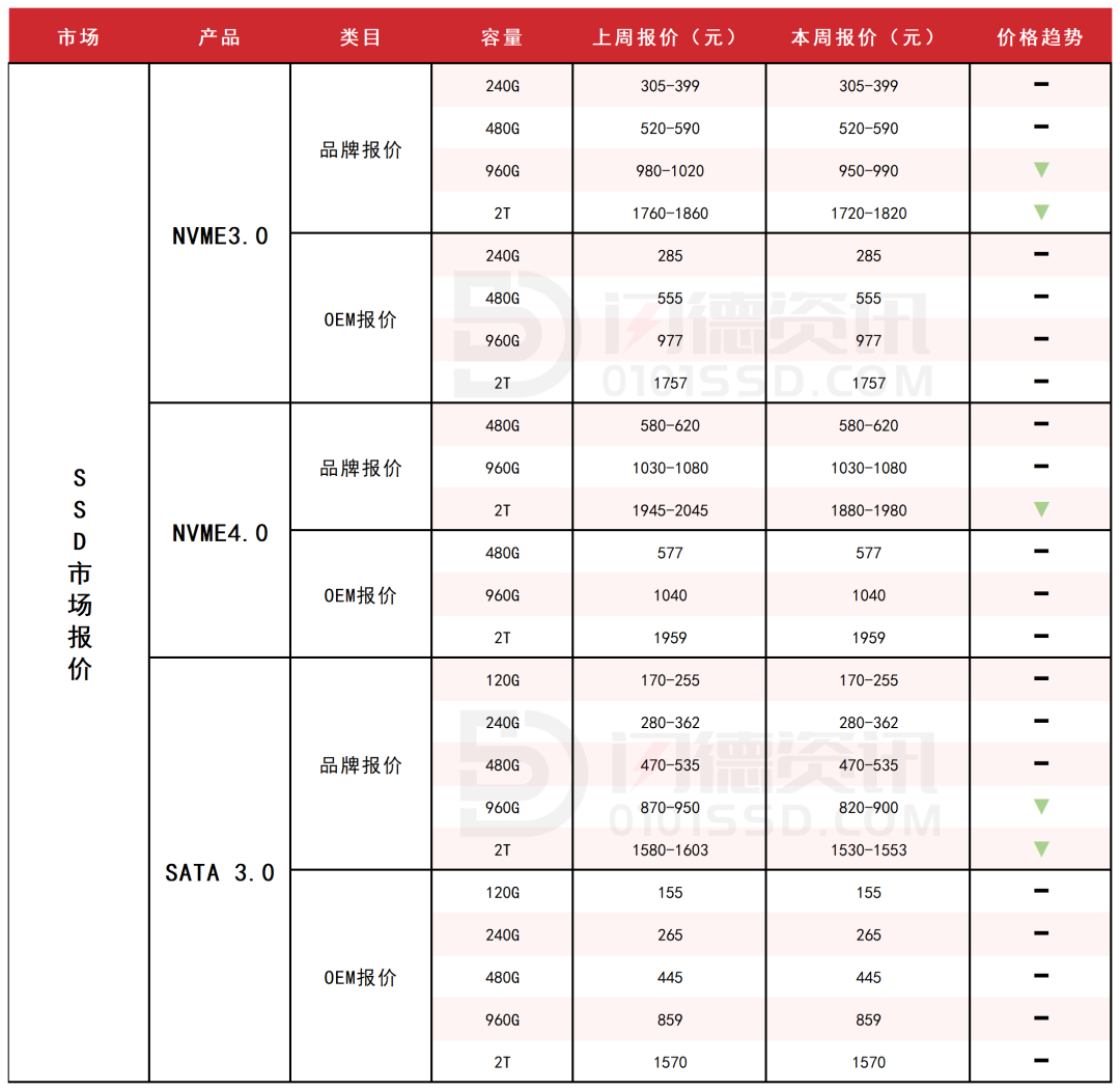 本周NVME4.0大致报价,除2T容量下跌2%左右,其它容量保持不变。