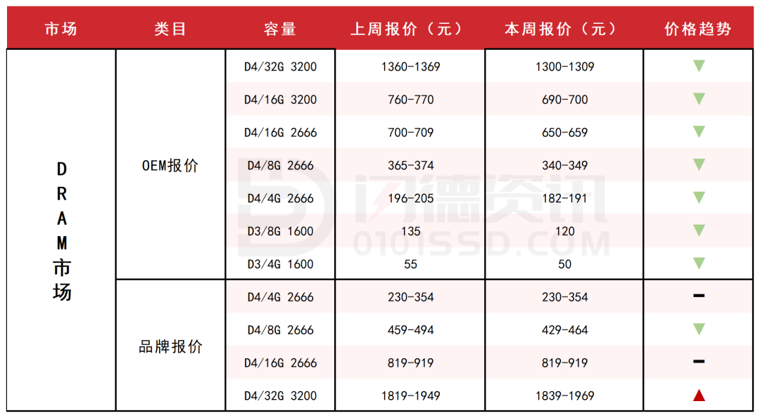 本周内存OEM市场报价,D4板块,所有容量呈下跌态势,跌幅区间在4%-9%左右;D3板块,所有容量呈下跌态势,跌幅区间在9%-11%左右。