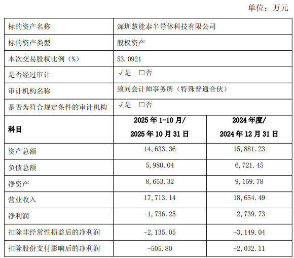 财务数据显示,慧能泰近年来呈现持续亏损状态。2024年度,慧能泰实现营业收入1.87亿元,净利润-2739.73万元;2025年1-10月实现营业收入1.77亿元,净利润-1736.25万元。截至2025年10月31日,慧能泰资产总额约1.46亿元,净资产约0.87亿元。