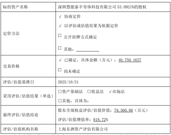 本次交易定价以2025年10月31日为评估基准日,采用市场法评估结果作为评估结论。评估机构上海东洲资产评估有限公司出具的报告显示,慧能泰股东全部权益评估价值为7.95亿元,评估增值率高达818.72%。