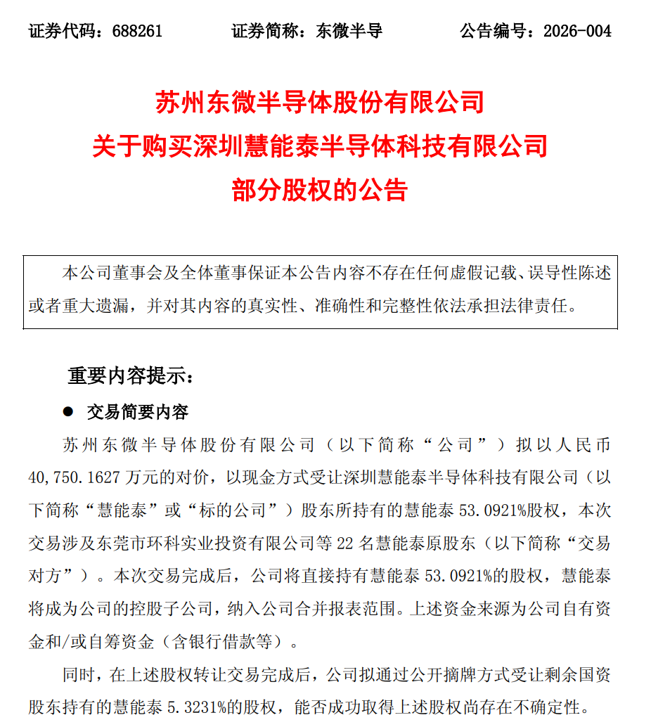3月24日晚间,东微半导发布公告,公司拟以人民币4.08亿元的对价,以现金方式受让深圳慧能泰半导体科技有限公司(以下简称"慧能泰")股东所持有的慧能泰53.0921%股权。交易完成后,慧能泰将成为东微半导的控股子公司,纳入公司合并报表范围。
