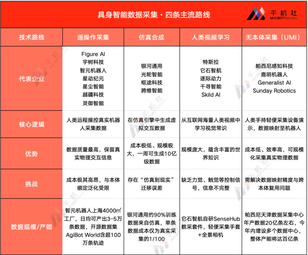 目前具身智能数据领域已分化出四条主流技术路线:遥操作采集、仿真合成、互联网视频学习、无本体采集,我们称之为驱动高质量具身智能数据发展的“四驾马车”。