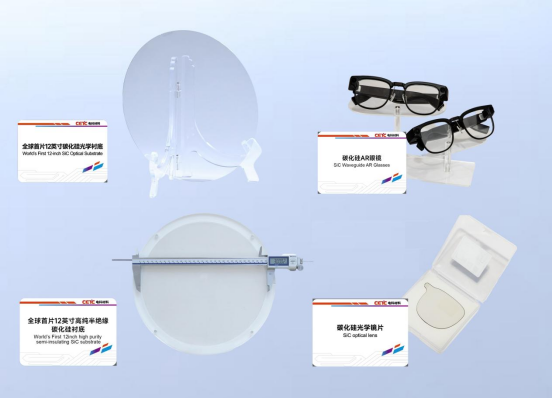 展会的主要亮点,当属电科材料带来的全球首片12英寸碳化硅光学衬底和全球首片12英寸高纯半绝缘碳化硅衬底。两款产品是AR眼镜光学镜片及各类高端光学制品的优质制备材料,相较传统光学材料实现了性能的大幅跃升,其折射率达2.7以上、视场角覆盖80°-110°,从材料层面解决了传统AR眼镜视场角窄、视觉沉浸感不足等行业痛点,同时能显著提升AR眼镜的佩戴舒适度,为AR眼镜产品的高端化、轻量化发展奠定了核心材料基础。