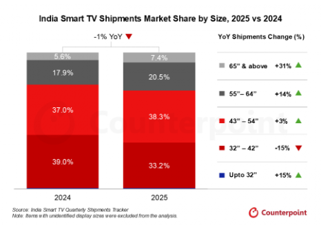 根据市场研究机构Counterpoint物联网服务的数据,2025年印度智能电视出货量同比基本保持平稳。全年市场呈现“前低后高”的走势,上半年因消费者信心疲软与可自由支出谨慎导致市场表现乏力,而下半年则在节日促销、优惠融资方案以及大屏幕电视价格下降的推动下需求强劲,成功抵消了上半年的颓势,其中第四季度出货量同比增长10%。政府将32英寸以上电视的消费税率下调,也进一步刺激了市场增长。