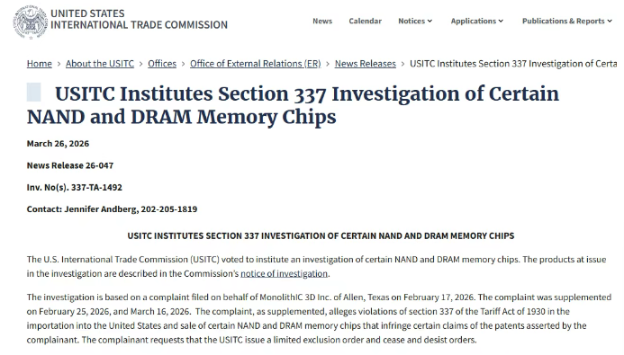 据悉,本次调查基于美国MonolithIC 3D公司于2026年2月17日提交的投诉。投诉指控被告违反了1930年《关税法》第337条,在进口和销售某些NAND和DRAM存储芯片的过程中侵犯了原告主张的某些专利权。原告请求美国ITC发布有限排除令以及停止侵权令。
