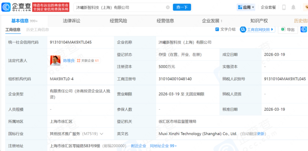 时隔两个多月,沐曦股份再度在上海出手,于 3 月 19 日投资设立沐曦新智科技(上海)有限公司,法定代表人同样为陈维良,注册资本 5000 万元人民币,登记于上海市徐汇区,仍为沐曦股份全资持股的外商投资企业法人独资公司。与此前的沐曦数智不同,沐曦新智的业务布局更具战略纵深,实现了从硬件到软件算法的全面延伸,其经营范围既延续了集成电路设计、集成电路芯片设计及服务等公司核心主业,更重点锚定人工智能领域,涵盖人工智能基础软件开发、人工智能理论与算法软件开发、人工智能应用软件开发等软件与算法层面的核心业务。