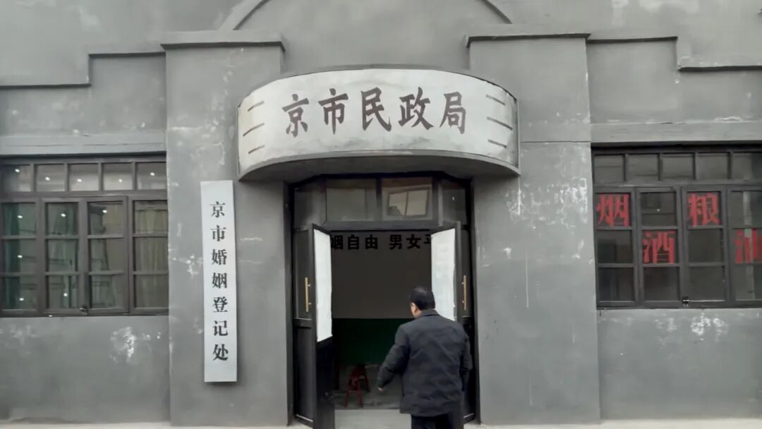 西安一个短剧影视基地里,剧组在年代感布景前拍摄。