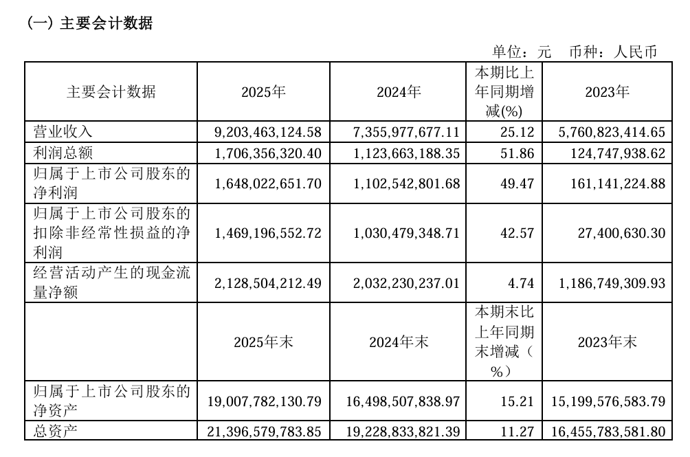 实现归母净利润约16.48亿元,同比增长49.47%。