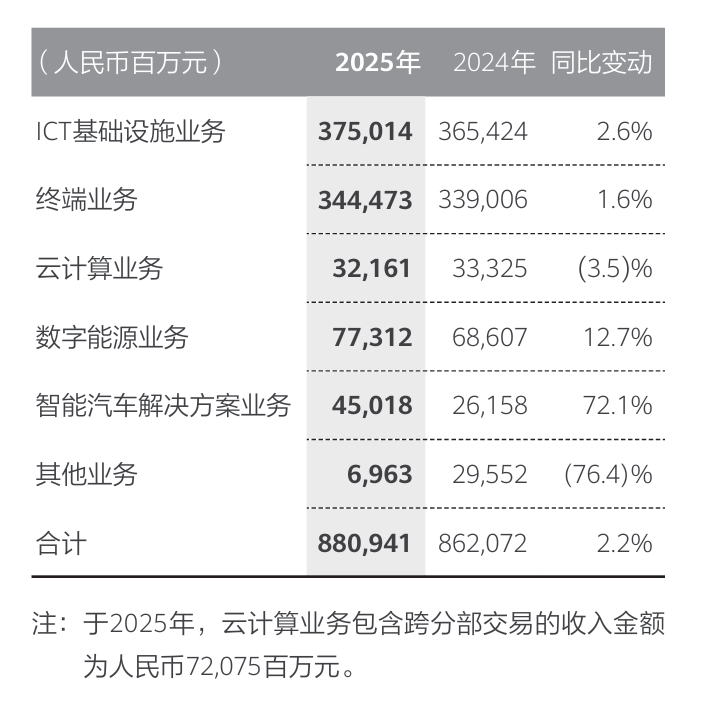 分业务来看,ICT基础业务和终端业务继续发挥支柱作用,收入分别为3750亿元和3444.7亿元,分别同比增长2.6%和1.6%;数字能源业务收入773亿元同比增长12.7%;智能汽车解决方案业务收入450.18亿元,同比大增72.1%,而云计算业务收入321.6亿元同比略降3.5%。
