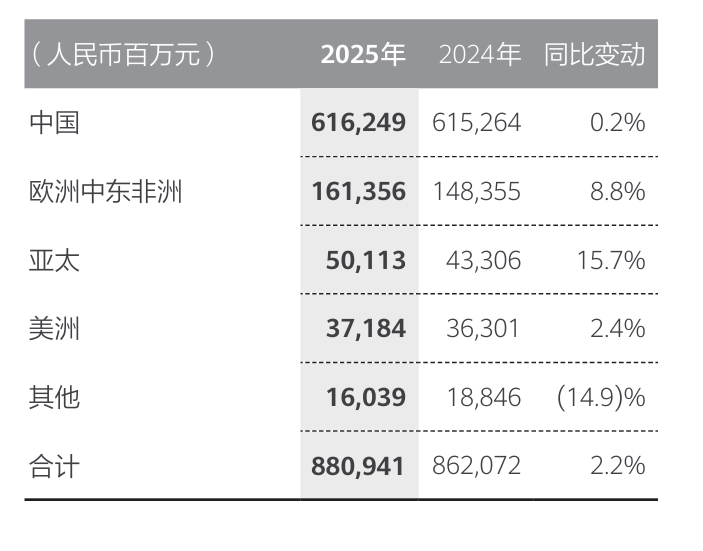 分区域来看,中国、欧洲、中东、非洲、亚太、美洲业务同比均实现增长,亚太成为增长最快的市场,收入达到501亿元,同比增长15.7%。中国市场受益于人工智能产业的快速发展和行业数智化转型升级加速,华为以一体机、集群、超节点等系列化产品和解决方案满足算力需求,中国市场受益于人工智能产业的快速发展和行业数智化转型升级加速,华为以一体机、集群、超节点等系列化产品和解决方案满足算力需求,总体实现销售收入人民币6162.49亿元,占总收入70%。