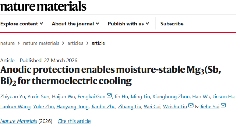Yu, Z., Sun, Y., Wu, H. et al. Anodic protection enables moisture-stable Mg3(Sb, Bi)2 for thermoelectric cooling. Nat. Mater. (2026).