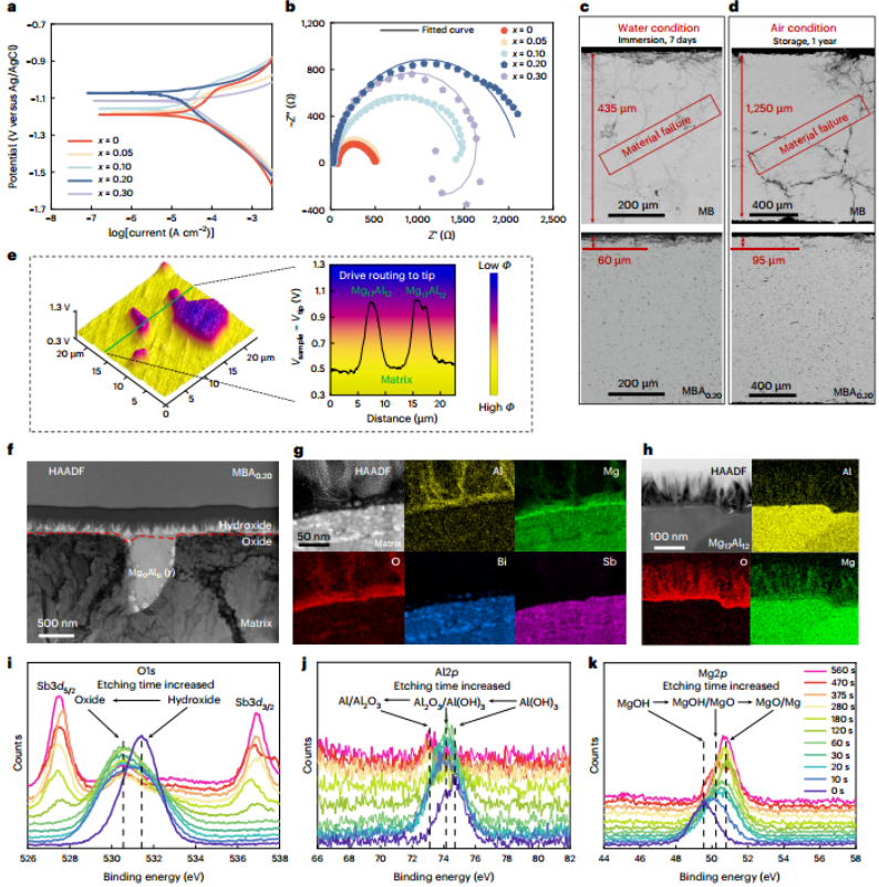 通过电化学动力学极化曲线测试,发现 Al 掺杂显著提高了材料的腐蚀电位并降低了腐蚀电流密度,其中 MBA0.20 样品在抗腐蚀性与热电性能间达到了最佳平衡。长期浸泡与存放实验表明,MBA0.20 在水中的腐蚀速率比未保护样品降低了 86%,在空气中暴露一年后仍保持结构完整,而未保护样品则彻底失效。防腐机制主要包含两个维度:首先,利用 Kelvin 探针力显微镜 (SKPFM) 证实 Mg17Al12 具有较低的功函数,电子会自发流向基体使其带负电成为阴极,从而在热力学上抵御O2和H2O的进攻。其次,在含水环境下,Mg17Al12优先发生牺牲性腐蚀,生成的 Mg2+和 Al3+与氢氧根结合,在表面原位形成致密的 Mg/Al 混合氢氧化物/氧化物层。这种保护膜不仅结构致密,还具有卓越的自修复能力,能长效隔离腐蚀介质。该原理随后在 Mg2(Sn, Ge) 和 CaMg2Bi2系统中得到验证,证明了其普适性。