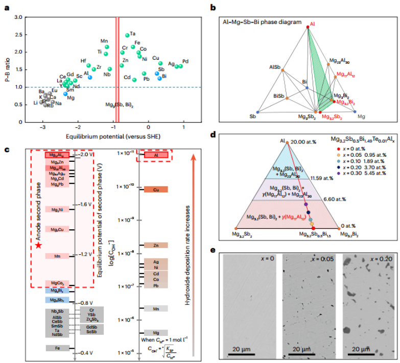 筛选理想的阳极第二相是一个多目标优化任务,需满足低电极电位、能形成致密氧化膜、具有高化学惰性及原位形成能力,且不能显著损害材料的热电性能。研究者首先计算了候选元素的 Pilling-Bedworth 比 (P-B ratio),筛选出 P-B 比大于 1 的元素(如 Al、Zr、Nb 等),以确保生成的氧化物层足够致密。通过分析电化学平衡电位,Mg17Al12被选定为候选,因其平衡电位(-1.99 V)远低于 Mg₃(Sb, Bi)2(约 -0.8 到 -0.9 V),能提供充足的热力学驱动力来保护基体。基于 Al-Mg-Sb-Bi 四元相图的计算,研究确定在富镁环境下,Al 掺杂会优先原位形成Mg17Al12相。实验制备的 MBAx样品证实,微纳尺度的Mg17Al12颗粒均匀分布在基体中。此外,Al 的氢氧化物溶度积极低,有助于在腐蚀初期快速形成覆盖层,从而阻止腐蚀向深处扩展。这种筛选策略为其他水敏功能材料的稳定性提升提供了科学指导。