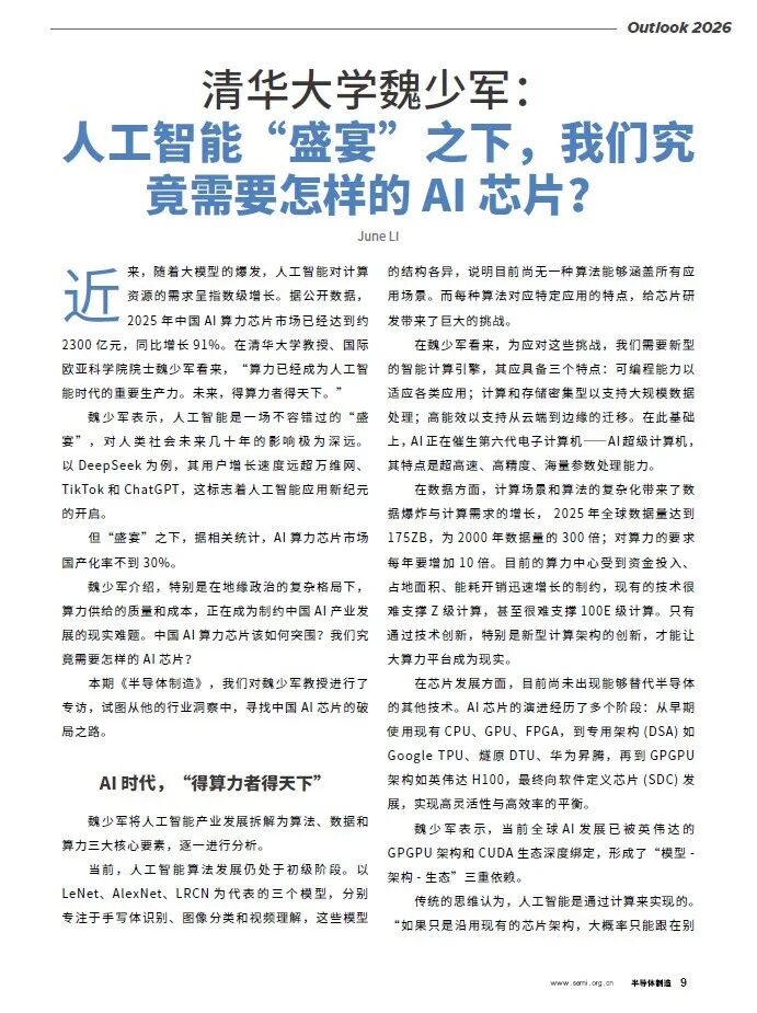 本期《半导体制造》,我们对魏少军教授进行了专访,试图从他的行业洞察中,寻找中国AI芯片的破局之路。