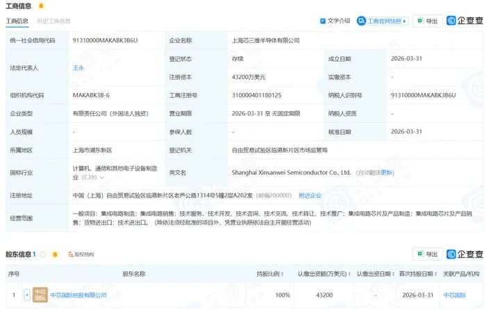 从股东信息来看,该公司由中芯国际控股有限公司全资持股。中芯国际作为半导体行业的领军企业,拥有先进的技术和丰富的行业经验。此次全资持股上海芯三维半导体,无疑是对其业务布局的重要拓展,有望在集成电路领域实现更深层次的突破。