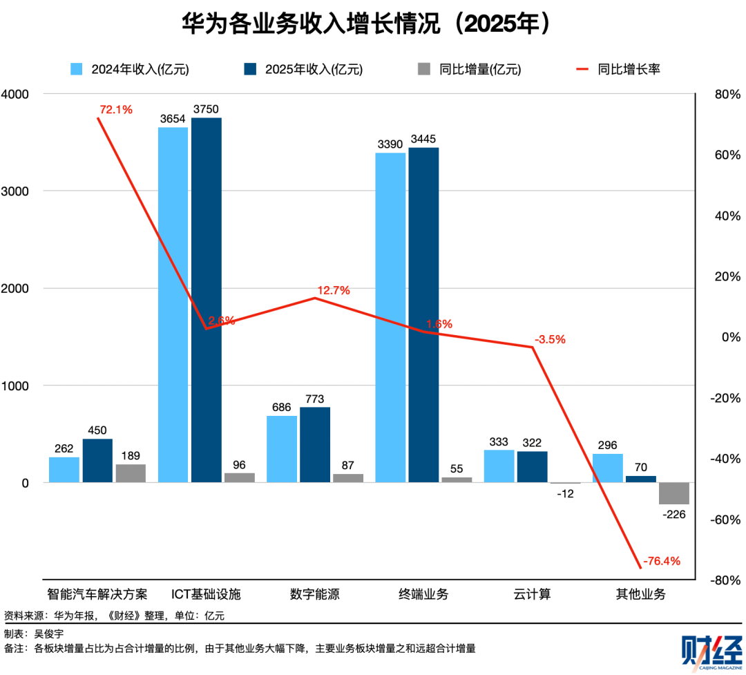 具体业务表现看,华为各业务板块的增长态势明显分化:智能汽车解决方案以188.6亿元增量、72.1%增速在六大板块中遥遥领先,正从“投入期”向“产出期”跨越。ICT基础设施(+95.9亿元)和数字能源(+87.05亿元)合计贡献183亿元增量,虽然增速不高,但体量大、增量可观,构成稳定基本盘。数字能源连续两年双位数增长,正在从“新兴业务”成长为“第三增长极”。